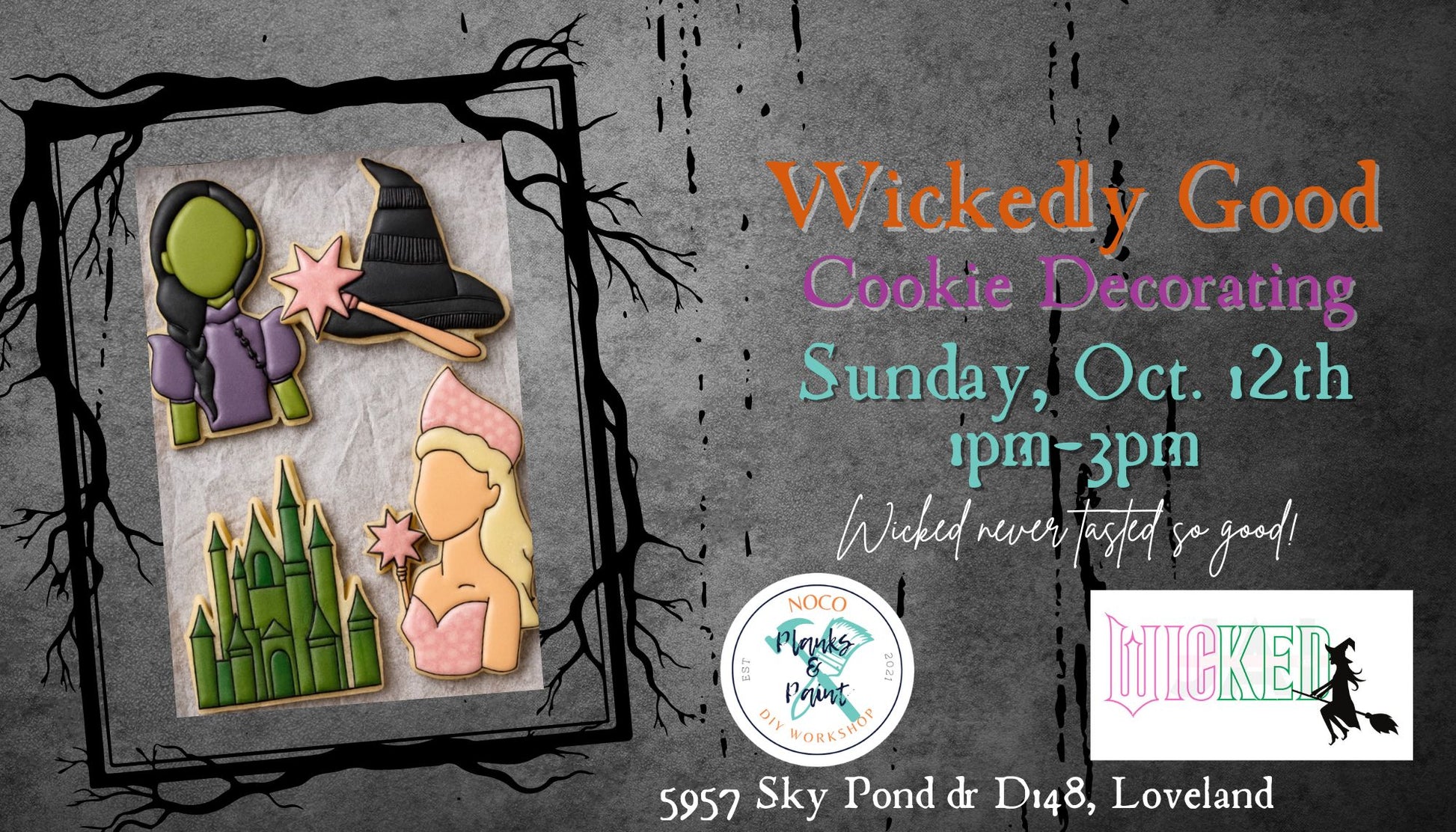 Join us Sunday, October 12th at 1pm as we partner with Ashley at Love & Baking, for a fun and festive Wickedly themed Royal Icing Cookie decorating class. This class will cover both basic and advanced decorating techniques! The class will provide 4 cookies and all of the supplies needed.